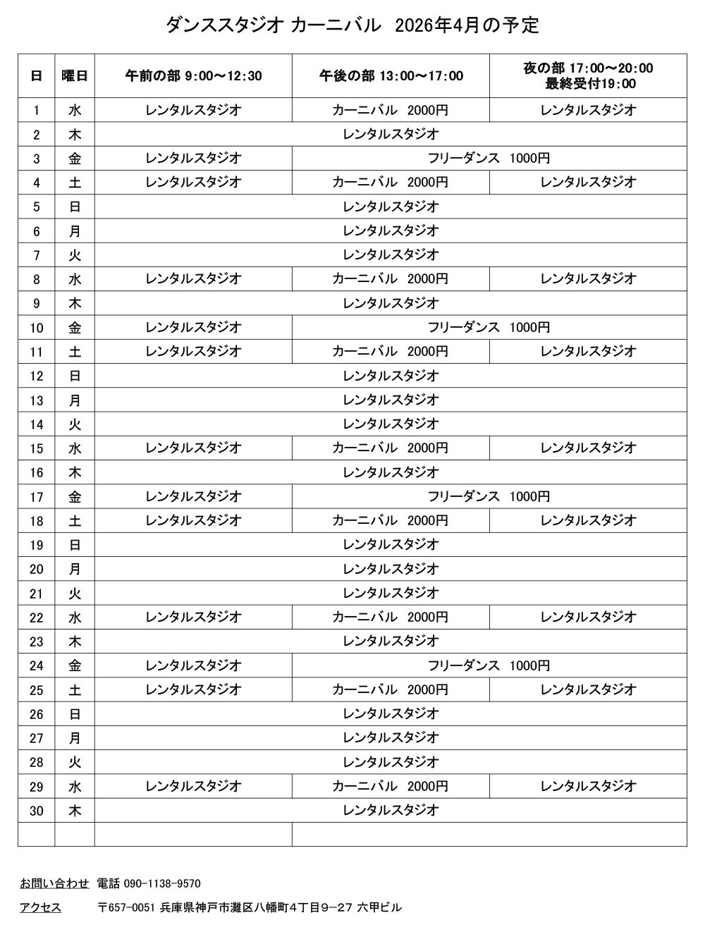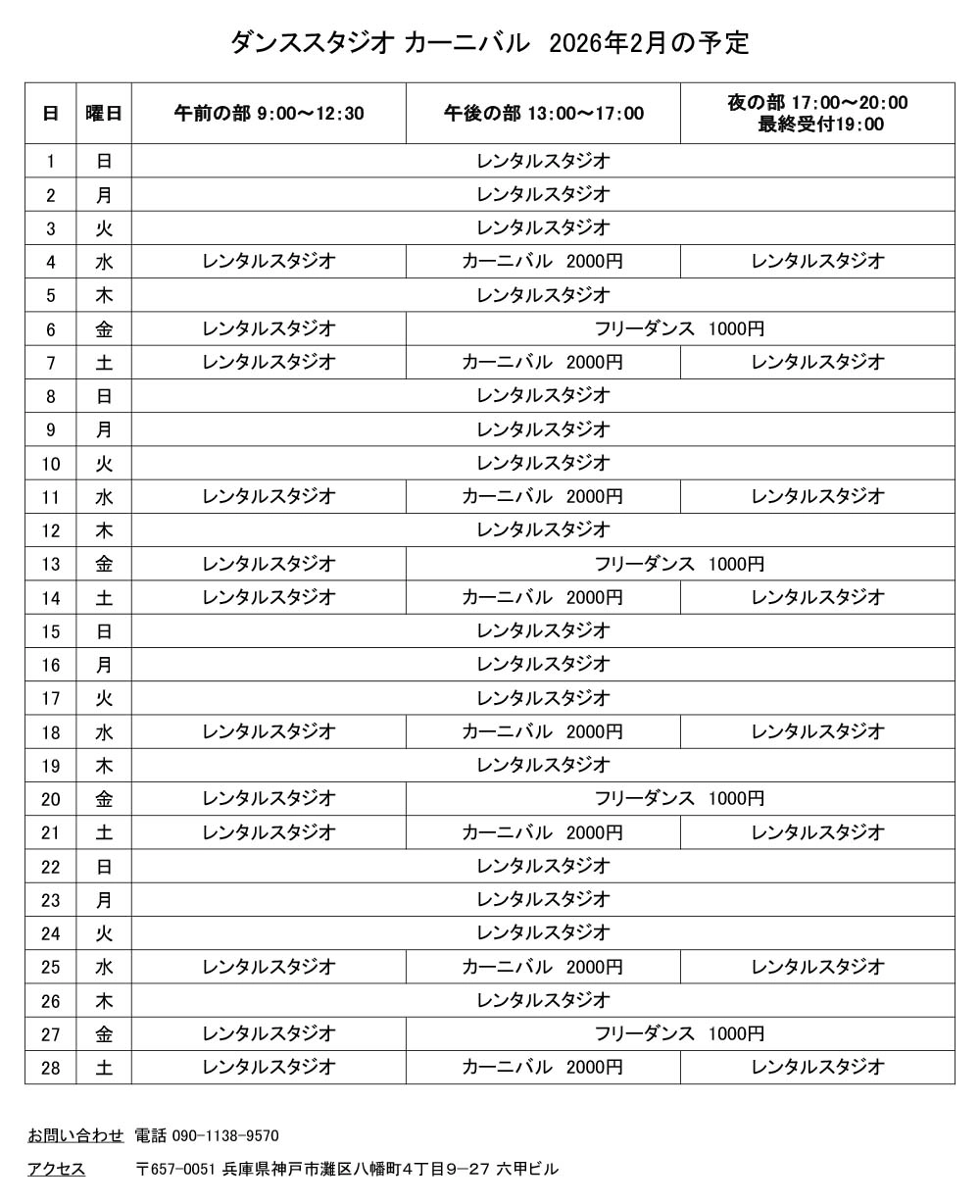 ダンススタジオカーニバルは、兵庫県神戸市、阪急神戸線六甲駅を出て徒歩1分のダンススタジオです。